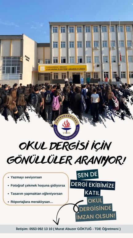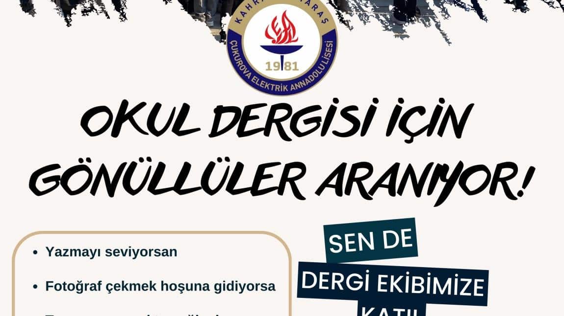 Çukurova Elektrik Anadolu Lisesi olarak bu yıl çıkarılacak okul dergimizde görev almak üzere gönüllü öğrenciler arıyoruz.